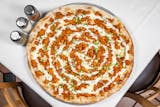Diced chicken sauteed in a spicy wing sauce served on brick oven crust topped with mozzarella blue cheese and scallions.